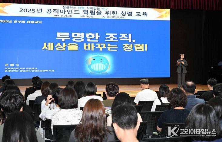 코리아타임뉴스 울산취재본부 | 울산 남구는 30일 구청 6층 대강당에서 전 직원 대상으로‘공직마인드 확립을 위한 제2차 청렴교육’을 실시했다.
