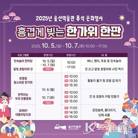 코리아타임뉴스 울산취재본부 | 울산박물관은 추석 연휴 동안 울산박물관과 울산대곡박물관에서 온 가족이 함께 즐길 수 있는 전통문화 행사를 마련한다고 밝혔다.