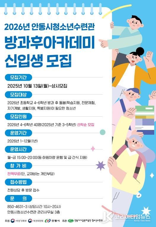 코리아타임뉴스 윤경수 기자 | 안동시시설관리공단이 운영하는 청소년수련관 방과후아카데미가 오는 10월 13일부터 2026년도 신입생 모집을 시작한다.
