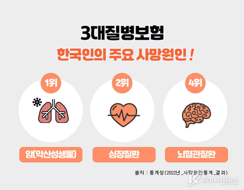코리아타임뉴스 박찬식 기자 | 3대질병으로 일컬어지는 암, 뇌혈관질환, 심혈관질환은 한국인의 주요 사망원인에서 상위를 차지하고 있으며, 이에 대한 진단비를 집중적으로 보장해 주는 보험상품을 3대질병진단비 보험이라 할 수 있다.