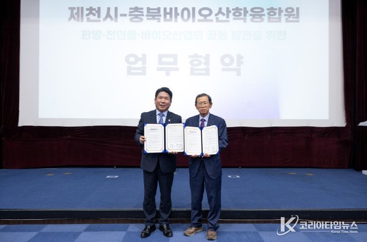 코리아타임뉴스 의료보건팀 | 제천시는 9월 30일 ‘2025 제천국제한방천연물산업엑스포’ 기간 중 한방생명과학관 다목적강당에서 충북바이오산학융합원과 한방·천연물산업 발전을 위한 업무협약(MOU)을 체결했다.