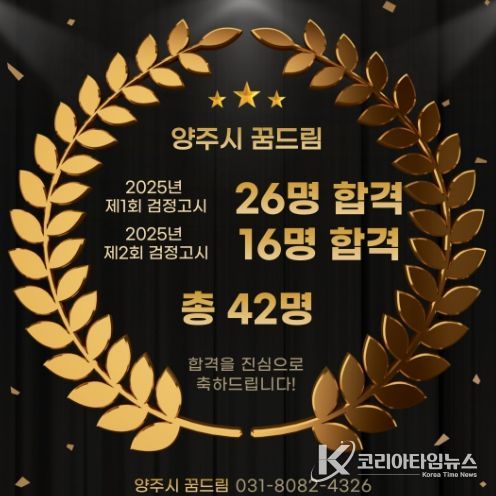 코리아타임뉴스 윤광희 기자 | 양주시 학교밖청소년지원센터 소속 청소년 42명이 지난 4월과 8월 실시된 2025년 초·중·고등학교 검정고시에 합격했다.