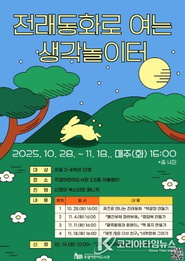 코리아타임뉴스 문화팀 | 고양특례시 주엽어린이도서관은 오는 10월 28일부터 11월 18일까지 북스타트 매니저와 함께하는 어린이 책놀이 프로그램 ‘전래동화로 여는 생각놀이터’를 운영한다고 밝혔다.