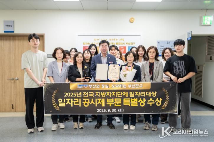 코리아타임뉴스 부산취재본부 | 부산 부산진구가 고용노동부 주관 ‘2025 전국 지방자치단체 일자리대상’ 지역일자리 목표 공시제 부문에서 특별상을 수상했다고 밝혔다.