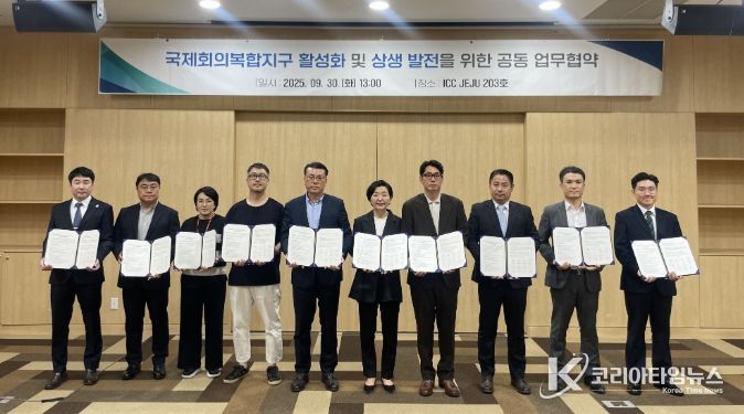 코리아타임뉴스 박찬식 기자 | 제주국제컨벤션센터(대표이사 이선화, 이하 ICC JEJU)는 9월 30일(화) 신라호텔 제주, 롯데호텔 제주, 파르나스호텔 제주 등 제주국제컨벤션센터 주변 숙박 및 관광시설 11곳과 ‘제주 국제회의복합지구 활성화 및 상생 발전을 위한 업무협약’을 체결했다.