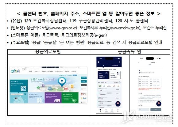또한 사용자 위치를 중심으로 병‧의원, 달빛어린이병원, 응급실 등의 진료과목, 진료여부 등 의료시설 정보를 제공하며, 연휴 기간에도 문 여는 병‧의원 및 약국 정보를 확인할 수 있다. ‘응급똑똑’앱은 구글 플레이스토어 및 애플 앱스토어에서 검색하면 설치‧이용할 수 있다.
