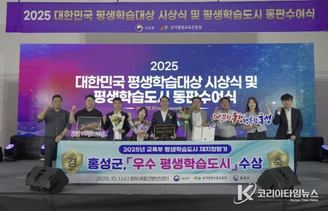 코리아타임뉴스 충남취재본부 | 홍성군은 지난 1일 정부세종컨벤션센터에서 열린 ‘2025 대한민국 평생학습대상 및 평생학습도시 동판수여식’에서 교육부장관 기관표창을 수상하며, 전국 평생학습 활성화를 선도하는 도시로 위상을 높였다.