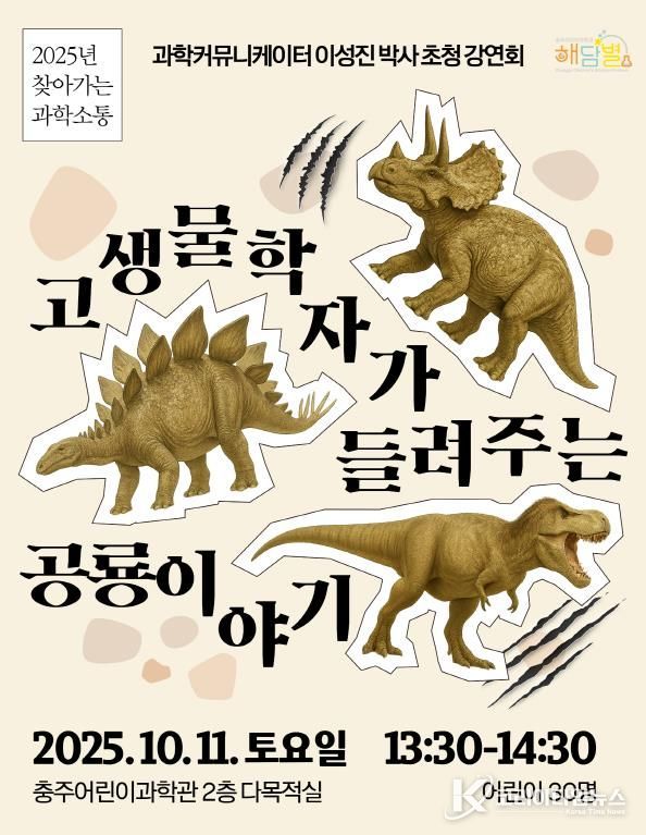 코리아타임뉴스 박찬식 기자 | 충주어린이과학관은 오는 10월 11일, 과학커뮤니케이터로 활동 중인 고생물학자 이성진 박사를 초청해 초등 저학년 어린이를 위한 특별 강연 ‘고생물학자가 들려주는 공룡 이야기’를 개최한다고 밝혔다.
