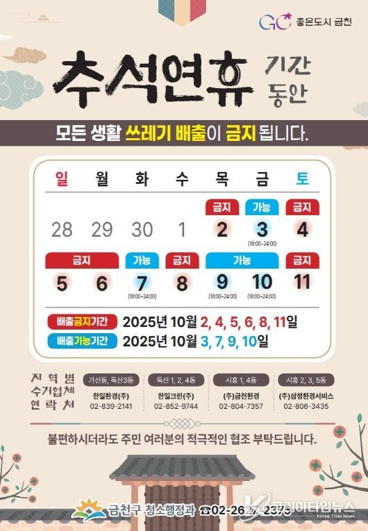 코리아타임뉴스 윤광희 기자 | 금천구는 추석 연휴 기간 생활쓰레기(일반생활쓰레기, 음식물쓰레기, 재활용품) 수거를 일시 중단한다고 밝혔다.