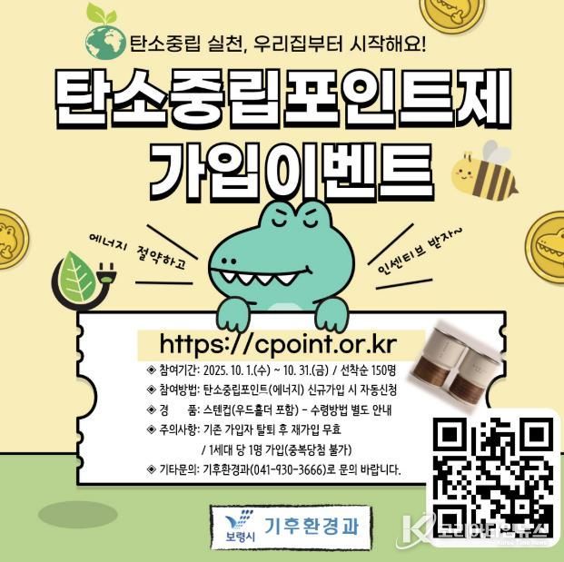 코리아타임뉴스 충남취재본부 | 보령시는 탄소중립 실현과 온실가스 감축을 위한 시민 참여 확대를 목표로 탄소중립포인트제 에너지 분야 신규가입자 대상 기념품 증정 이벤트를 10월 31일까지 실시한다고 밝혔다.