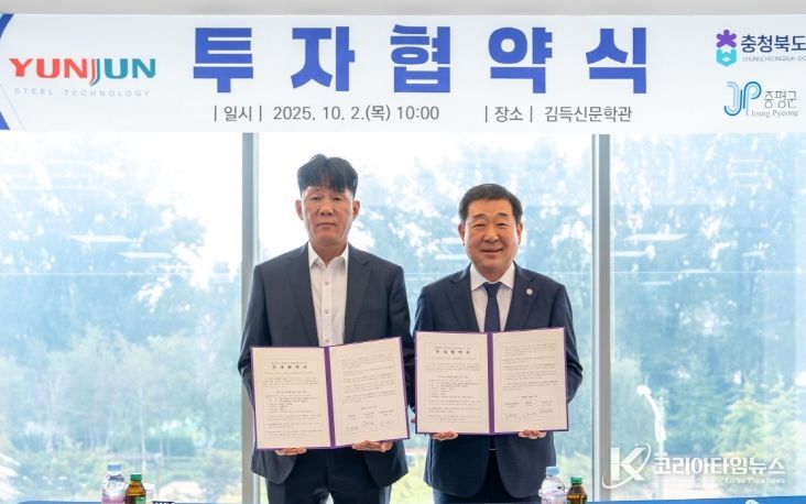 코리아타임뉴스 이아름 기자 | 충북 증평군은 2일 김득신문학관에서 충북도, ㈜윤준에스티(대표이사 김태수)와 증평3일반산업단지 내 공장을 신설하는 투자협약(MOU)을 체결했다.