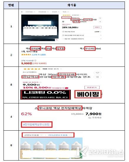 코리아타임뉴스 의료보건팀 | 식품의약품안전처는 시중에서 판매되는 ‘무니코틴 표방 액상 흡입제품’에 대해 ‘의약외품(니코틴이 포함되지 않은 흡연욕구저하제, 흡연습관개선보조제)’ 오인 우려 광고로 보아 지난 9월 집중 점검을 실시했다.