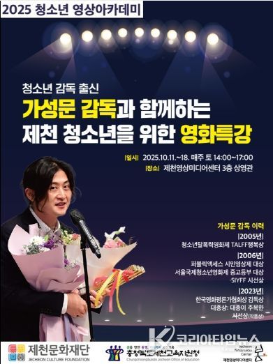 코리아타임뉴스 충북취재본부 | 제천문화재단은 오는 11일과 18일 오후 2시 제천영상미디어센터 봄에서 ‘청소년 영상아카데미’교육생을 대상으로 가성문 감독과 함께하는 청소년 영화특강을 개최한다고 밝혔다.