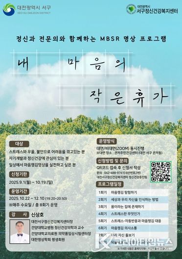코리아타임뉴스 의료보건팀 | 대전 서구는 구민들의 스트레스 완화와 정신건강 증진을 위해 정신과 전문의와 함께하는 ‘마음 챙김 명상(MBSR)’ 프로그램 ‘내 마음의 작은 휴가’ 참여자를 10월 19일까지 모집한다.