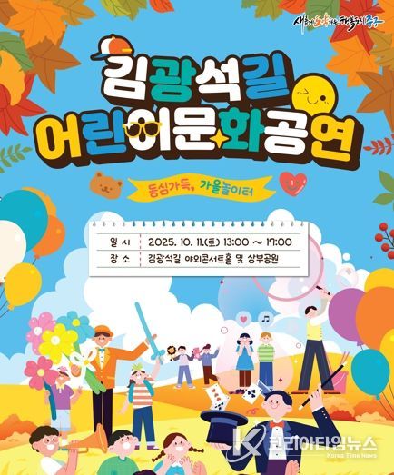 코리아타임뉴스 박찬식 기자 | 대구 중구는 인구 10만 회복을 기념해 오는 11일 오후 1시부터 5시까지 김광석길 야외콘서트홀과 상부 공원에서 ‘김광석길 어린이 문화공연–동심가득, 가을 놀이터’를 개최한다.