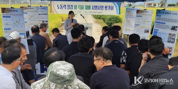 코리아타임뉴스 충남취재본부 | 서천군농업기술센터는 지난 2일 서천군 화양면 고마리 일원에서 벼농사 생력화와 저탄소 농업실천 확대를 위한 ‘벼 직파재배 현장 평가회’를 개최했다.