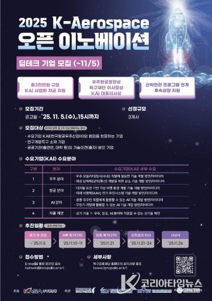 코리아타임뉴스 오영주 기자 | 우주항공청은 10월 13일 우주항공청이 주최하고 한국항공우주산업㈜, 연구개발특구진흥재단, 진주강소특구(경상대학교), 한국항공우주연구원이 주관하는 '2025 K-Aerospace 오픈 이노베이션'을 추진하여 딥테크 기업을 육성할 계획이라고 밝혔다.