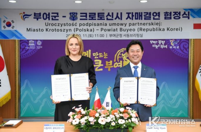 코리아타임뉴스 충남취재본부 | 부여군)은 지난 11일 부여군청에서 폴란드 비엘코폴스카주 크로토신시 대표단을 공식 초청해 자매결연 협정을 체결했다.