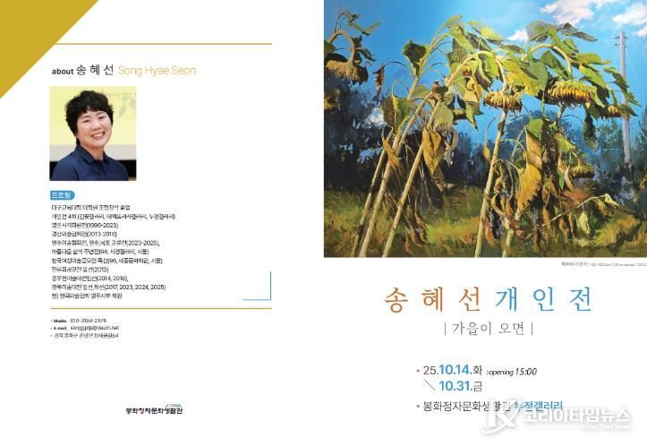 코리아타임뉴스 경북취재본부 | 봉화정자문화생화관은 10월 14일부터 31일까지 누정갤러리에서 송혜선 작가의 개인전 '가을이 오면'을 개최한다.
