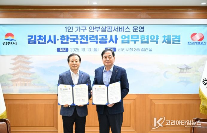 코리아타임뉴스 윤경수 기자 | 김천시는 지난 13일 한국전력공사 대구본부 김천지사(지사장 박용성)와 함께 ‘1인 가구 안부살핌서비스 '든든e살핌'’ 업무협약을 체결했다.