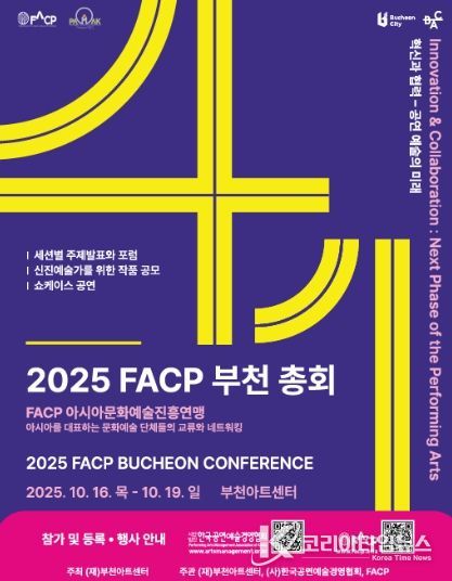 코리아타임뉴스 경기취재본부 | (재)부천아트센터가 주최하고, (재)부천아트센터·아시아문화진흥연맹(FACP)·(사)한국공연예술경영협회가 공동 주관하는‘제41회 2025 FACP 부천 총회(Federation for Asian Cultural Promotion, 이하 FACP)’가 10월 16일부터 19일까지 4일간 부천아트센터 일대에서 개최된다.