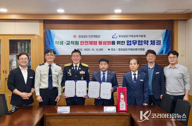 코리아타임뉴스 김태훈 기자 | 경상남도 소방본부 13일 경상남도 안전체험관과 거제교육지원청이 체험 중심 안전교육 강화를 위한 업무협약(MOU)을 체결했다고 밝혔다,