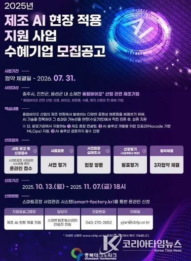코리아타임뉴스 오영주 기자 | 충북도는 오는 11월 7일까지 도내 주력산업인 융합바이오 산업과 인공지능(AI) 기술의 융합 촉진을 위한 ‘제조 AI 현장 적용 지원사업’의 참여기업을 모집한다고 14일 밝혔다.