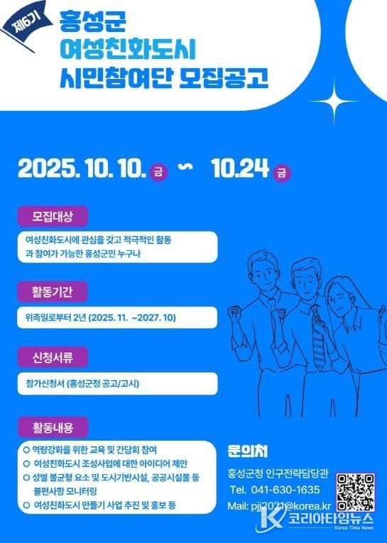 코리아타임뉴스 충남취재본부 | 홍성군이 ‘여성친화도시’ 조성을 위한 시민참여단 모집에 나섰다.