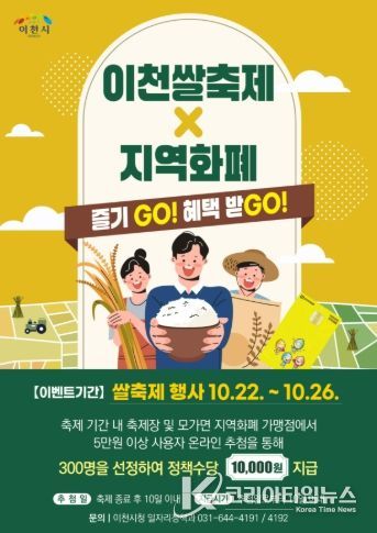 코리아타임뉴스 기동취재팀 | 이천시는 2025 이천쌀문화축제 기간에 지역화폐 이용을 촉진하고 지역경제를 활성화하기 위해 코나아이(주)의 경기지역화폐 사회공헌 재원을 활용하여 ‘이천쌀축제, 지역화폐로 즐기고(GO), 혜택받고(GO)’ 이벤트를 추진한다고 밝혔다.