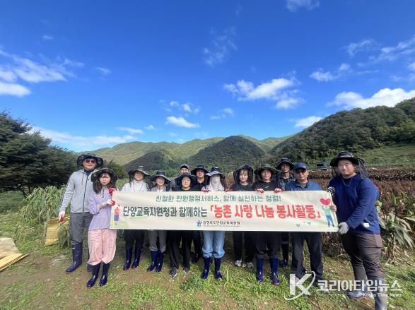코리아타임뉴스 사회팀 | 단양교육지원청 직원 20여 명은 15일 일손 부족으로 어려움을 겪는 지역 농가를 돕기 위해 ‘농촌 사랑나눔 봉사활동’을 진행했다.