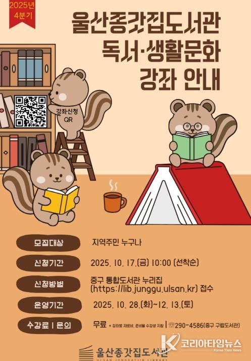 코리아타임뉴스 울산취재본부 | 울산 중구에서 운영하는 울산종갓집도서관이 2025년 4분기 독서·생활문화강좌 수강생을 모집한다.