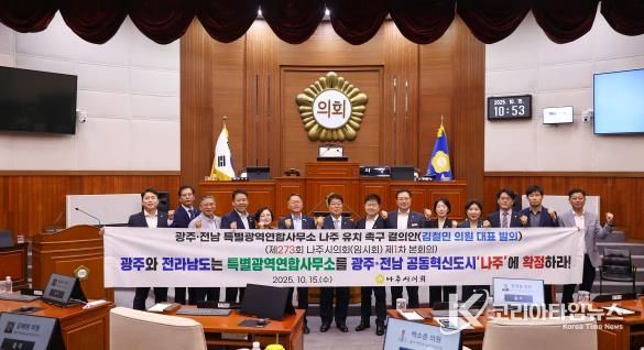 코리아타임뉴스 노승선 기자 | 나주시의회는 15일 제273회 임시회 제1차 본회의를 열고 ‘광주·전남 특별광역연합사무소 나주 유치 촉구 결의안’을 채택했다.