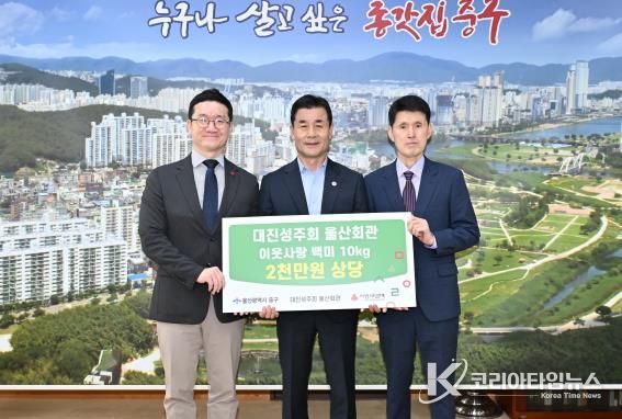 코리아타임뉴스 울산취재본부 | 대진성주회 울산회관이 10월 15일 오후 2시 30분 중구청 구청장실을 찾아 울산사회복지공동모금회를 통해 2,000만 원 상당의 이웃돕기 백미 10kg 540포를 전달했다.