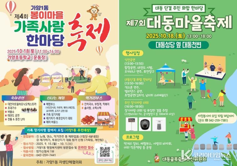 코리아타임뉴스 대전취재본부 | 대전 동구는 오는 18일 구 대표 마을 축제인 ‘제4회 가양1동 봉이마을 가족사랑 한마당 축제’와 ‘제7회 대동 마을축제’를 잇따라 개최한다고 15일 밝혔다.