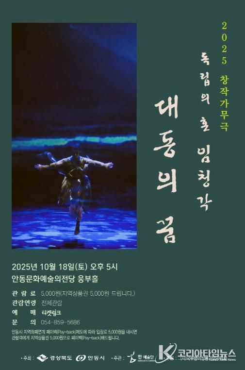코리아타임뉴스 노승선 기자 | 한예술단이 주최․주관하는 '2025 창작가무극 독립의 혼 임청각 ‘대동의 꿈’' 공연이 10월 18일 오후 5시, 안동문화예술의전당 웅부홀에서 개최된다.