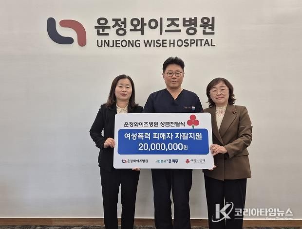 이날 기탁금 전달식에 참석한 노성혁 원장은 “어려운 상황에 놓인 여성폭력 피해자들이 용기와 희망을 되찾는 데 조금이나마 힘이 되고 싶다”라며 “운정와이즈병원은 앞으로도 지역사회 의료기관으로서 사회적 책임을 다하고, 나눔과 상생의 가치를 실천하는 데 앞장서겠다”라고 밝혔다.