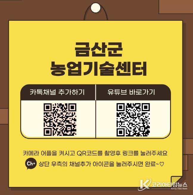 코리아타임뉴스 충남취재본부 | 금산군농업기술센터는 농업인과 군민들이 더 쉽고 빠르게 농업 정보를 접할 수 있도록 카카오톡과 유튜브 홍보 채널 운영을 하고 있다고 밝혔다.
