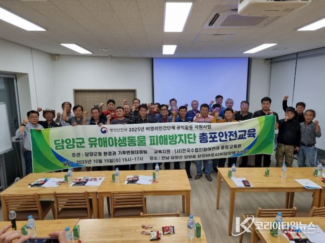 코리아타임뉴스 전남취재본부 | 담양군은 지난 15일 에코교육관에서 유해야생동물 기동포획단을 대상으로 포획활동 시 준수사항과 총기사고 예방 등을 위한 안전교육을 진행했다.