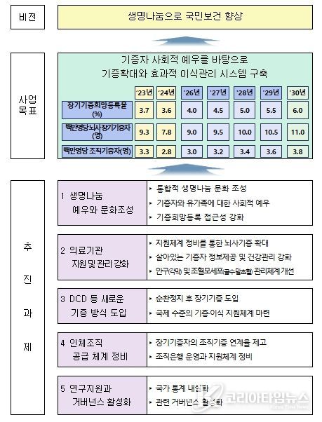 이번 종합계획은 ▲향후 5년간 민간중심에서 공공까지 기증희망등록기관*을 대폭 확대해 기증자 모집을 늘리고, ▲이식 선진국에서는 이미 보편화된 연명의료 중단 후 심장사한 기증 희망자의 장기기증(DCD;Donation after Circulatory Death)을 법제화하여 기증을 확대하는 한편, ▲기증자 예우는 세심하게 강화하는 것을 중점으로 한다.