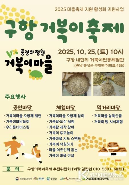코리아타임뉴스 충남취재본부 | (재)홍주문화관광재단 문화도시센터는 ‘마을 축제 지원 및 활성화 사업’의 일환으로 오는 25일 오전 10시부터 오후 4시까지, 충남 홍성군 구항면 거북로 436 일원에서 ‘구항 거북이 축제’를 개최한다.