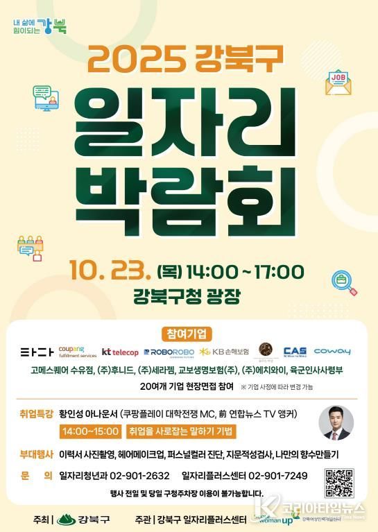 코리아타임뉴스 문화팀 | 서울 강북구는 오는 10월 23일 오후 2시부터 5시까지, 강북구청 광장에서 ‘2025 강북구 일자리박람회’를 개최한다고 밝혔다.