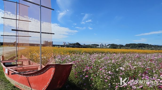 코리아타임뉴스 충남취재본부 | 부여군은 2025년 가을을 맞아 백마강 일원에 코스모스 단지를 조성하고, 황포돛배 경관을 새롭게 선보이며 가을철 대표 관광 명소로 자리매김하고 있다.