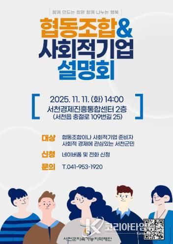 코리아타임뉴스 충남취재본부 | (재)서천군지속가능지역재단은 오는 10월 20일 오후 2시, 서천경제진흥통합센터에서 ‘협동조합·사회적기업 설명회’를 연다.