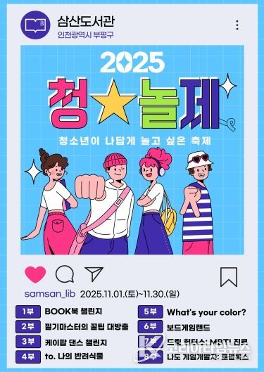 코리아타임뉴스 문화팀 | 부평구 구립 삼산도서관은 11월 한 달간 청소년(중학교 1학년~고등학교 3학년) 대상 문화체험 프로그램 ‘청★놀제: 청소년이 나답게 놀고 싶은 축제’를 운영한다.