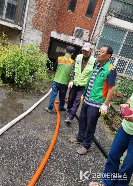 코리아타임뉴스 사회팀 | 평택시 지산동에 있는 빌라 지하실에 지난 14일 침수가 발생했다. 이에 지산동 자율방재단은 즉시 현장으로 출동해 단원 8명과 함께 긴급 배수 작업을 실시하며 주민 피해 최소화에 나섰다.