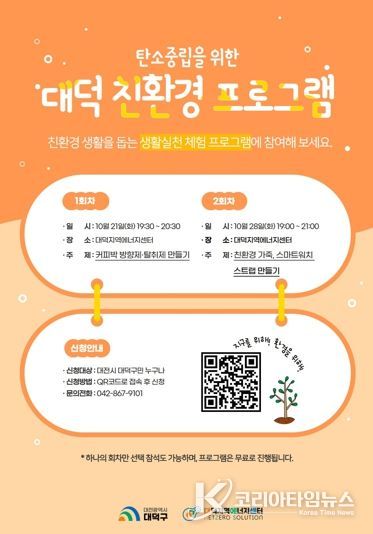 코리아타임뉴스 대전취재본부 | 대전 대덕구는 일상에서 손쉽게 실천할 수 있는 친환경 생활문화를 확산하기 위해 오는 11월까지 매월 체험형 프로그램을 운영하고 있다고 밝혔다.