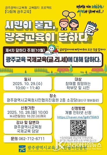 코리아타임뉴스 사회팀 | 광주시교육청시민협치진흥원은 오는 29일 오전 10시부터 2시간 동안 본원 소강당에서 시민 소통 행사 ‘시민이 묻고, 광주교육이 답하다’를 운영한다.