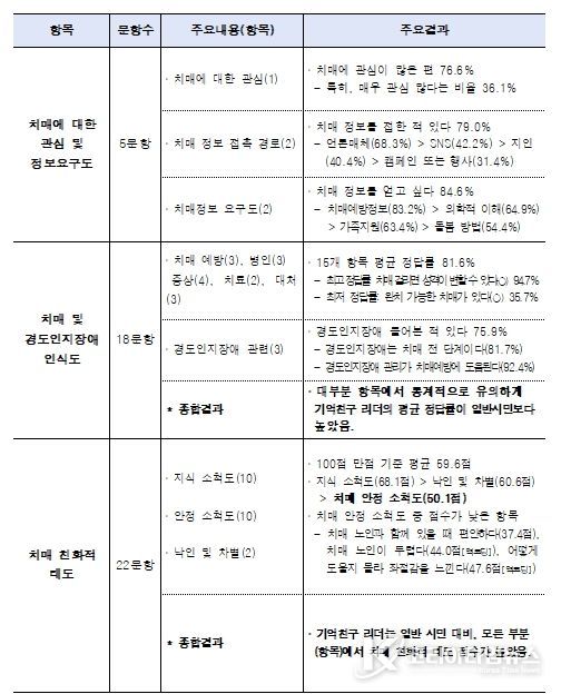 조상 대상별로 분석하면 일반시민보다 서울시광역치매센터의 교육을 받은 후 치매환자와 환자 가족을 돕는 ‘기억친구 리더’가 치매 인식도와 친화태도 항목에서 높은 점수를 보였다.