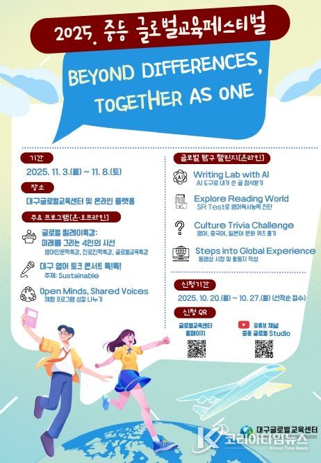 코리아타임뉴스 사회팀 | 대구교육연수원 산하 대구글로벌교육센터는 11월 3일부터 8일까지 ‘Beyond Differences, Together as One(차이를 넘어, 하나로)’을 주제로 '2025 중등 글로벌교육페스티벌'을 개최한다.