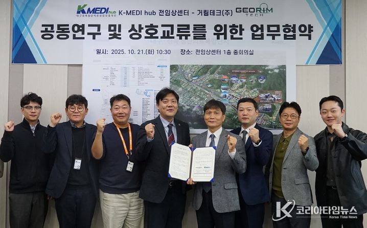 코리아타임뉴스 의료보건팀 | 케이메디허브(대구경북첨단의료산업진흥재단) 전임상센터가 21일 거림테크(주)와 필름 기반 의료기기 공동개발을 위한 업무협약을 체결했다.